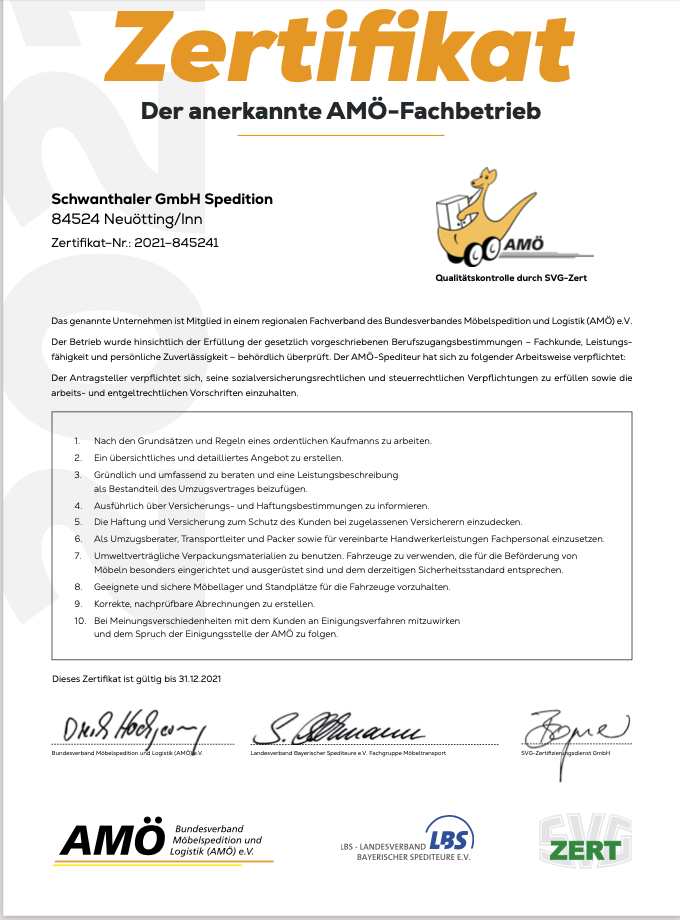 Der Bundesverband Möbelspedition und Logistik (AMÖ) e.V. verleiht im Rahmen der AMÖ-Abgrenzungskampagne das AMÖ-Zertifikat „anerkannter AMÖ-Fachbetrieb“. Die damit ausgezeichneten Betriebe verpflichten sich selbst über die fachliche Kompetenz, Leistungsfähigkeit sowie Zuverlässigkeit hinaus zu einer umfassend hohen Qualität ihrer Dienstleistungen und haben damit die Möglichkeit, sich vom Wettbewerb abzugrenzen. Verbraucherschutz Der Qualitätsnachweis leistet einen wichtigen Beitrag zum Verbraucherschutz. Die begleitende Qualitätskontrolle wird von der SVG Zert durchgeführt. Die mit dem AMÖ-Zertifikat ausgezeichneten Spediteure verpflichten sich, als ordentlicher Kaufmann zu handeln: Sie beraten gründlich und umfassend und erstellen übersichtliche und detaillierte Angebote sowie Rechnungen. Als Umzugsberater, Transportleiter und Packer werden nur Fachleute mit geeigneter und sicherer Technik und Geräten sowie umweltverträglichen Verpackungsmaterialien eingesetzt. Sollte es dennoch zu Meinungsverschiedenheiten mit dem Kunden kommen, wirken die Betriebe an einem Einigungsverfahren mit und folgen dem Spruch der Einigungsstelle der AMÖ. Zur Prüfung für das AMÖ-Zertifikat müssen von den Unternehmen wichtige Lizenzen wie die Güterkraftverkehrs-Erlaubnis und die EU-Lizenz vorgelegt werden. Wenn keine Transporte im Selbsteintritt durchgeführt werden, muss das Verzeichnis der eingesetzten Subunternehmer im Abgleich mit den Geschäftsprozessen vorgelegt werden. Weiterhin werden die Verkehrshaftungs- und die Betriebshaftpflichtversicherung geprüft sowie anhand des Lohnsummennachweises an die BG Verkehr und andere gesetzliche Unfallversicherungen das Erfüllen der sozialversicherungsrechtlichen und steuerrechtlichen Verpflichtungen. Sehr detailliert werden die Übereinstimmung von Angeboten und Abrechnung geprüft, insbesondere auf die folgenden Angaben: Unternehmensname mit Rechtsform, Inhaber / Vertretungsberechtigter, Anschrift, HRG-Nummer (sofern eintragungspflichtig), USt-Ident Nr., Be- und Entladeadresse, Umfang des Umzugsgutes, klare Hinweise auf kostenpflichtige Bestandteile, Umfang der zu erbringenden Leistung, Einzelpositionen oder Festpreis für Gesamtleistung, Ausweisung der Mehrwertsteuer, Vertrag mit Annahme durch Kunden, Leistungsbeschreibung, Verwendung der Haftungsinformation sowie Hinweis im Angebot über weitergehende Versicherung. Außerdem müssen in den Haftungsinformationen besondere Passagen (Schadensmeldefristen) drucktechnisch hervorgehoben werden, auch der Hinweis auf die Einigungsstelle der AMÖ darf in den AGB nicht fehlen. Bei Einsatz eines Subunternehmers werden Angaben kontrolliert wie Transportabgabe-Auftrag, Güterkraftverkehrs-Erlaubnis, Versicherungen/ Haftungsangaben, Vereinbarung bezüglich Personal / Qualitätskriterien (bzw. AMÖ-Zertifikat). Die fachliche Qualifikation des Personals wird stichprobenartig über Personalakten und Tätigkeitsnachweise überprüft. Dazu werden die entsprechenden Personalblätter, Arbeitsscheine und der Dispoplan herangezogen. Des Weiteren muss das Unternehmen verschiedenen Nachweise erbringen: Es werden nur Umzugskartons aus Recyclingmaterial verwendet. Es werden Fahrzeuge mit festem Aufbau bzw. verschließbarem Heck eingesetzt, inklusive Container und Wechselbrücken. Außerdem werden die Möglichkeiten der Ladungssicherung durch Zurrleisten, Zurrtöpfe, o.ä. und Gurtmaterialien geprüft und ob die Ausrüstung gemäß EN 12522 mit Decken und Kisten vorhanden ist. Falls Möbellager angeboten werden, müssen sie trocken, abschließbar sowie für unbefugte Dritte unzugänglich sein. Lagerpartien müssen eindeutig getrennt sein. Abschließbare Lagercontainer bzw. Wechselbehälter müssen sich auf einem abgeschlossenen Betriebsgelände befinden.Umzug & Material
